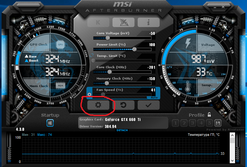 Переходим к главному. Суть в том чтобы СНИЗИТЬ частоты графического проца и памяти. Конечно это странно звучит для стрых видеокарт,но именно СНИЗИТЬ.